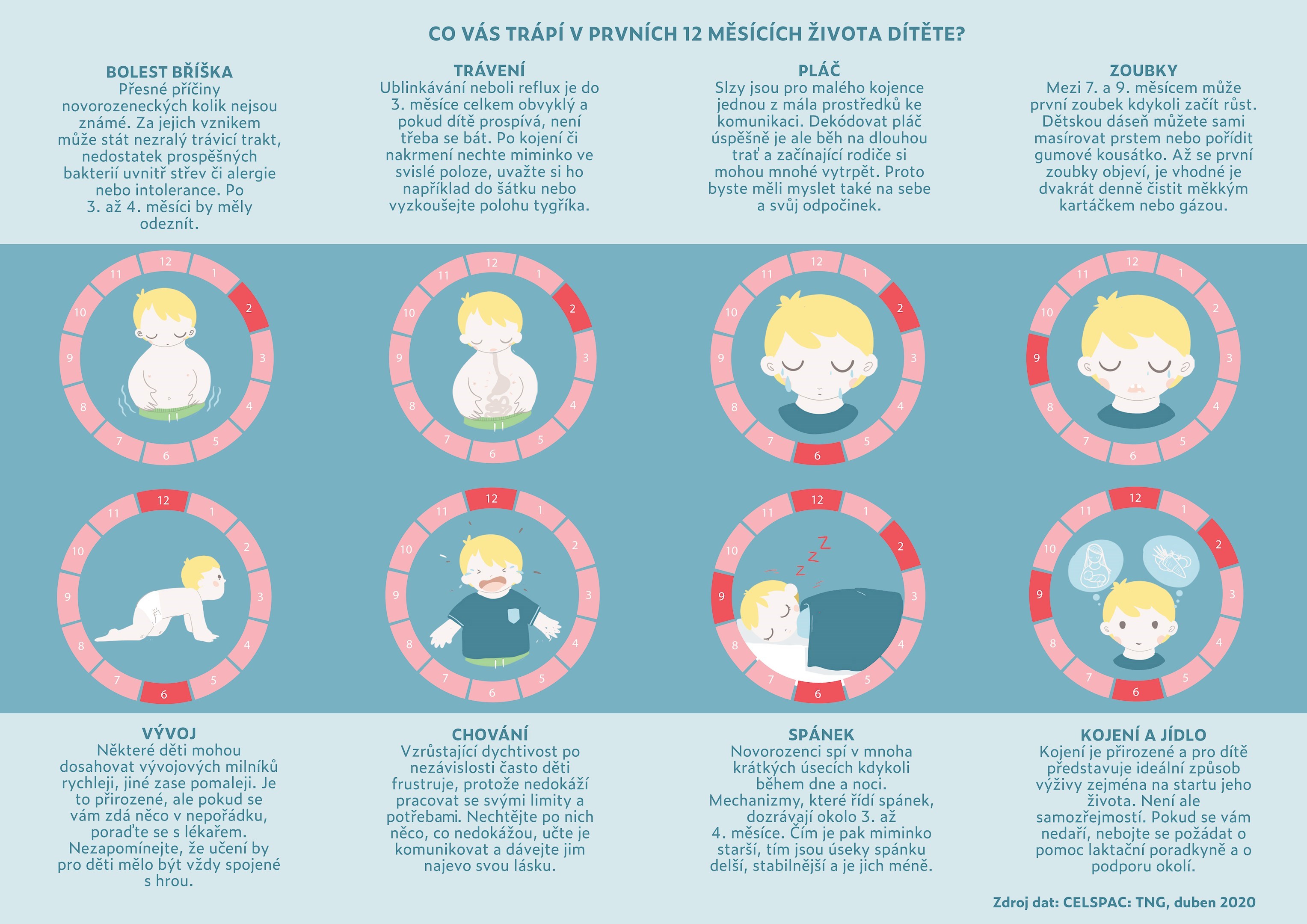 Příchod nového člena do rodiny znamená jednoznačně velkou radost. Věříme ale, že může zamávat s nejednou domácností. Co maminkám dělá ohledně jejich dětí největší starosti v prvních 12 měsících života? V každém dotazovaném období to byl spánek, kojení nebo celkově problémy s krmením. Naopak bolesti bříška či potíže s trávením trápily děti jenom na začátku, v druhém měsíci po narození. Ty pak vystřídal pláč nebo růst zoubků. Na druhou stranu nám maminky psaly, jak je těší pokroky, které děti dělají a nejvíc je dokáže potěšit dětský úsměv.